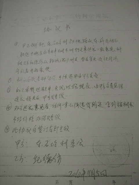 2010年11月,东石岭村两委通过广播对村里辖属的山地树木进行叫行(竞标),纪德仿叫走了树木,并与村委签订了协议。