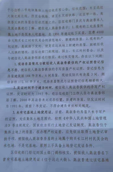 “就被征收人反映的情况,区征收部门到规划、国土、长江村村委会,以及与被征收人高淑香邻居进行核实,通过核实情况,存在以下问题: