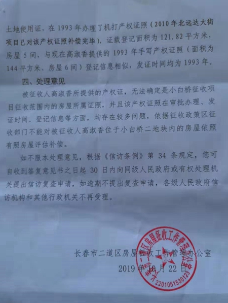 既然房子都拆除了,为什么没有给补偿呢?长春市二道区房屋征收工作管理办公室《关于高淑香信访事项的处理意见书》(长二征收办字([2019]79号)的说法是:他们的房子存在一些问题。