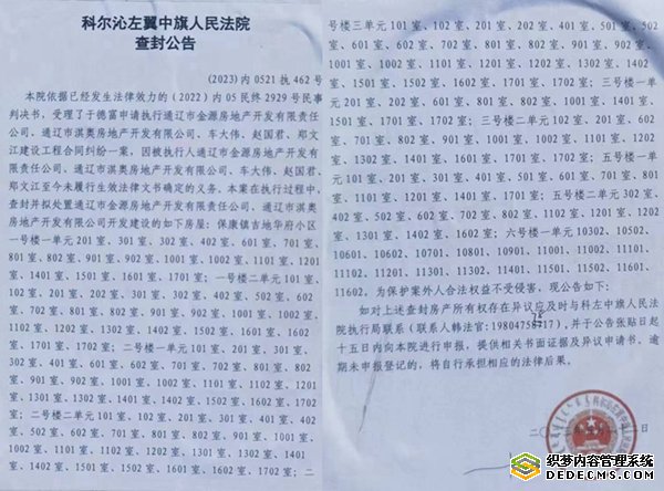科尔沁左翼中旗,简称科左中旗,其旗政府所在地就是保康镇,而保康镇吉地华府小区是一个棚户区改造项目。对于该项目的经济纠纷,媒体曾经多次报道。据媒体报道,2014年4月初,通辽市科左中旗保康镇棚户区改造项目对外发包,工程建筑总面积为87696.82平方米。吉林省长春市人徐凤琴与开发商签订了《建筑工程施工合同》并进行了施工。2018年10月1日,吉地华府小区完工后,开发商却没有按照合同约定给付徐凤琴工程款。为了讨回巨额工程款,徐凤琴历经多年诉讼最终胜诉,通辽市中级法院作出(2020)内05民初158号民事判决书,判决三名开发商向徐凤琴支付尾欠工程款31018965.80元以及利息,随后通辽市中级法院将开发商位于吉地华府的相关房产进行了查封,用于偿还徐凤琴的工程款。哪曾想,半路上杀出来一个程咬金,车大伟、赵国君、郑文江在给排水工程款纠纷案中败诉,科左中旗法院查封了他们在吉地华府的房产。法院的查封公告(2023)内0521执462号)称:“本院依据已经发生法律效力的(2022)内05民终2929号民事判决书,受理了于德富申请执行通辽市金源房地产开发有限责任公司、通辽市淇奥房地产开发有限公司、车大伟、赵国君、郑文江建设工程合同纠纷一案,因被执行人通辽市金源房地产开发有限责任公司、通辽市淇奥房地产开发有限公司、车大伟、赵国君、郑文江至今未履行生效法律文书确定的义务。本案在执行过程中,查封并拟处置通辽市金源房地产开发有限责任公司、通辽市淇奥房地产开发有限公司开发建设的如下房屋......”