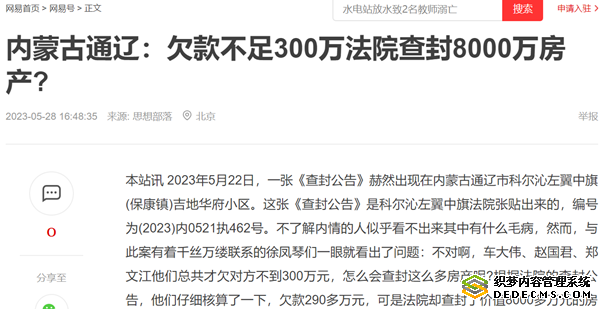 本站讯 2023年5月22日,一张《查封公告》赫然出现在内蒙古通辽市科尔沁左翼中旗(保康镇)吉地华府小区。这张《查封公告》是科尔沁左翼中旗法院张贴出来的,编号为(2023)内0521执462号。不了解内情的人似乎看不出来其中有什么毛病,然而,与此案有着千丝万缕联系的徐凤琴们一眼就看出了问题:不对啊,车大伟、赵国君、郑文江他们总共才欠对方不到300万元,怎么会查封这么多房产呢?根据法院的查封公告,他们仔细核算了一下,欠款290多万元,可是法院却查封了价值8000多万元的房产,共计188套房子,其中仅仅是门市房就有19套之多!