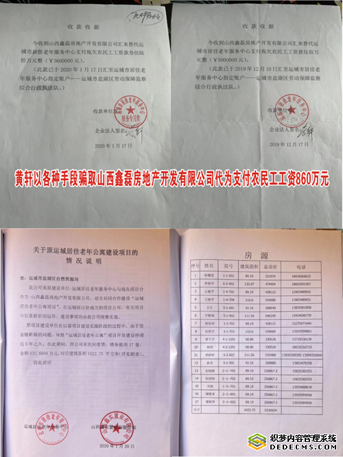 但时至今日,相关部门无实质性处置方案以解决拖欠部分农民工工资和所欠工程款。而开发商黄轩四方八面坑蒙拐骗, 农民工资是开发商黄轩从山西鑫磊骗取捌佰陆拾万元支付的,只是支付了部分农民工工资,他还危言耸听,以下收据为证。