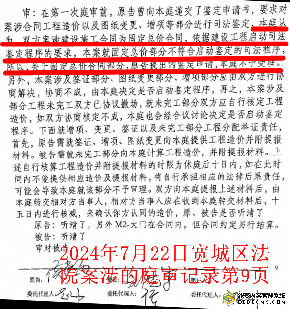 侯惠敏还激动的说:请问李洪武法官,该合同已经被判处无效,固定总价怎么能有效呢?因为固定总价是依据设计的办公楼图纸签订的建筑工程施工合同,那么本图纸都不在了,也没有使用,那固定总价怎么能有效呢?实际施工的是设计变更后的公寓楼图纸,两者之间相差工程造价千万元。为什么不允许我们申请重新做司法鉴定?李洪武法官,你这样做,不是明显在袒护被告一方吗?在此案中,设计图纸变更了,也没有盖审批章,监理公司在没有设计变更审批盖章的情况下就让我们按照新图纸施工,这一切都是严重的违法违规行为。对于这些问题,我将向吉林省住建厅进行实名举报。如果法官李洪武不保护我的司法鉴定权利,就涉嫌枉法裁判。我不管开发商崔波、法官李洪武有什么样的背景,有什么样的后台,有什么样的保护伞,我都将去中央纪委、国家监委、最高人民法院去控告,以维护我的合法权益。