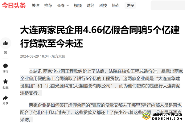 本站讯 两家企业因工程款纠纷上了法庭,法院在核实工程总造价时,暴露出两家企业曾用假的施工合同骗取了银行5个亿的工程贷款。这两家企业就是“大连宜华建设集团”和“北首光源科技(大连)股份有限公司”,而为他们贷款的是建行大连青泥洼桥支行。