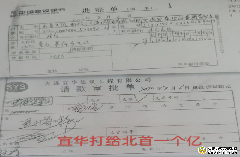 两家企业在打工程款官司时,北首光源科技为法院提供了每次给大连宜华打款的帐目凭证,法院也核查出,该工程总造价为3.22亿元。截止到2014年6月6日,北首光源科技共打给大连宜华工程款为3.64亿元,但是,这些款项并没有全用在该工程上,大连宜华的帐目显示,在2010年7月6日,大连宜华将收到的工程款2180万元,打给了与此工程无关的北首科技下属的另一家公司。2010年8月3日,大连宜华又将1亿元贷款直接转给了北首光源科技,最终这个项目实得工程款仅为2.43个亿,可银行确确实实贷出了5个亿,还有近1.4个亿下落不明。