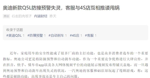 近年,家庭用车的安全性能成了很多厂商的主打功能,也是众多消费者选车的一个重要指标。奥迪公司更是将防撞预警和自动刹车功能,作为一个重要竞争优势进行大肆宣传,并在抖音、快手、懂车帝app以及各大网络视频平台的功能展示视频发布得铺天盖地,而一旦遇到奥迪预警和自动刹车出现失灵的状况,一汽奥迪的客服和4S店却玩起了甩锅游戏,称:这些都是辅助功能,出现事故还是车主自己的问题。