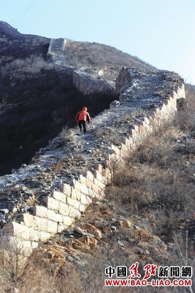 长城保护工作者梅景田在花家窑残长城上巡查。本报资料图片