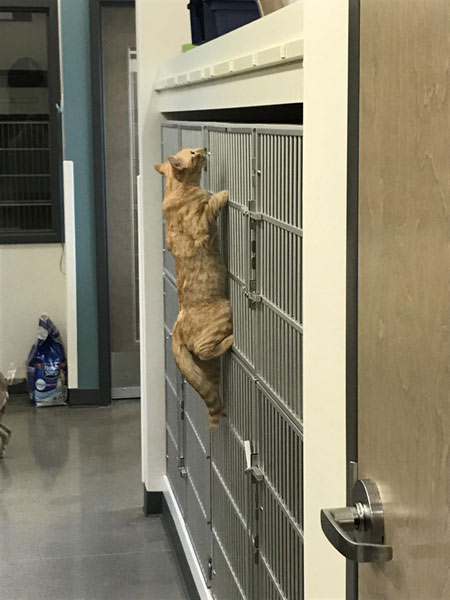 “它会接近其他的猫猫狗狗,一点都不害怕,还会试着爬进它们的笼子里。”医院的负责人之一萨利·桑德尔说。