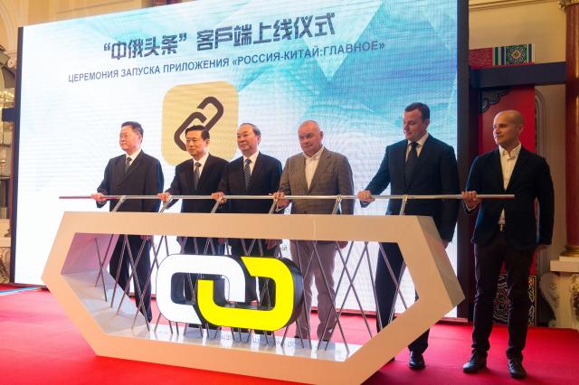 2017年7月3日,在俄罗斯首都莫斯科,嘉宾出席“中俄头条”双语客户端上线仪式。(新华社发)