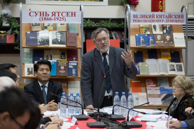 2016年12月5日,俄罗斯中国友好协会5日在俄罗斯科学院远东研究所举行专家学者座谈会,纪念孙中山先生诞辰150周年,俄中友协副主席卢贾宁主持。(新华社发)