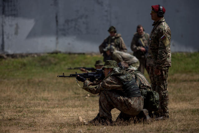 2016年7月6日,在俄罗斯莫斯科,中俄参训队员进行射击训练。(中俄举行“合作-2016”联合反恐训练。新华社发)