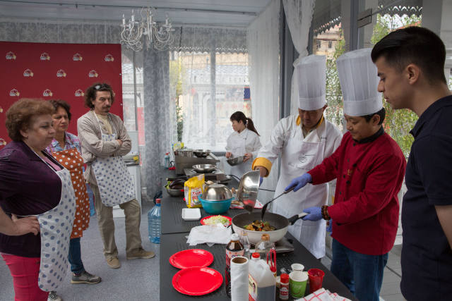 2017年7月17日,在俄罗斯首都莫斯科革命广场,厨师向当地民众展示地三鲜的制作过程。(“地坛庙会全球行”莫斯科之旅。新华社发)
