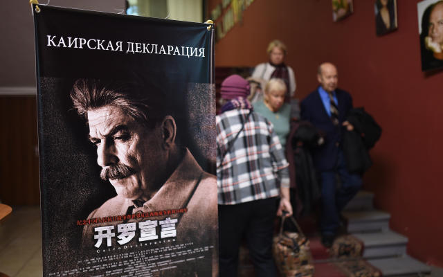 2015年12月3日,在俄罗斯莫斯科,观众从中国电影《开罗宣言》的海报旁走过。(新华社)