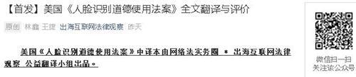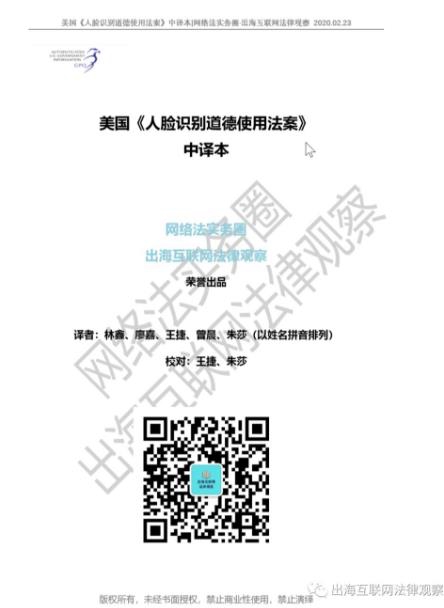 美国《人脸识别道德使用法案》中译本由网络法实务圈 * 出海互联网法律观察 公益翻译小组出品。