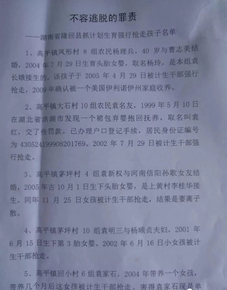 在2002年到2005年期间,湖南隆回县高平镇的计生干部以老百姓征收社会抚养费为由,强行抱走当地老百姓的孩子,予以没收,然后把这些孩子以弃婴的名义,由邵阳市社会福利院送往美国等地,从中牟利。