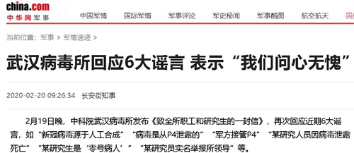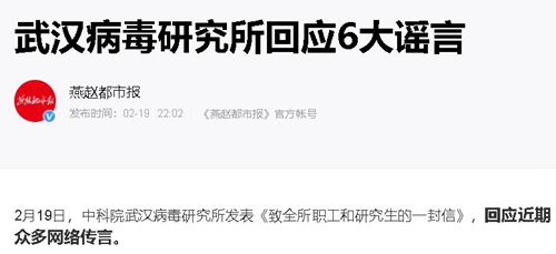 2月19日,中科院武汉病毒研究所发表《致全所职工和研究生的一封信》,回应近期众多网络传言。
