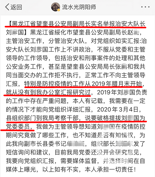 近日,一篇题为《黑龙江省望奎县公安局副局长实名举报治安大队长刘某国》的帖子在网络中流传。帖文称,黑龙江绥化市望奎县公安局治安大队长刘某国在疫情期间突然破格提拔,其提拔程序受到多位公安干警和局领导的质疑,并被主管副局长实名举报。