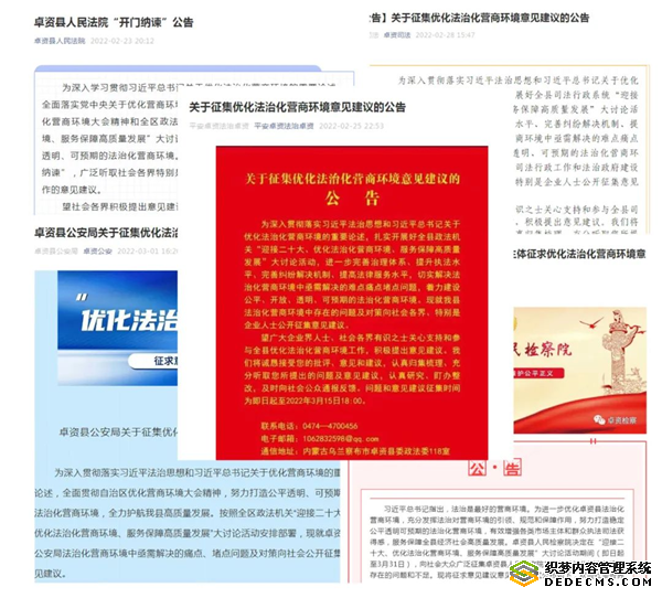 全县政法机关充分运用“互联网+”的方式,在“卓资县长安网”及“平安卓资法治卓资”、“卓资县人民法院”、“卓资检察”、“卓资公安”、“卓资司法”等官方网站和微信公众号上,发布了《关于征集优化法治化营商环境意见建议的公告》,形成网络宣传矩阵,广泛宣传优化法治化营商环境征求意见工作。