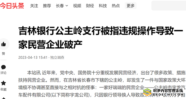 本站讯 近年来,党中央、国务院十分重视发展民营经济,出台了很多政策、措施扶持民营企业。然而,在吉林省长春市下辖的公主岭,却发生了一件与国家政策大环境极不协调甚至直接与之相对抗的怪事:一家好端端的民营企业——公主岭市宇龙汽车配件有限公司(以下简称宇龙公司),只因银行领导换人导致政策转向,银行为了自身利益被指违规操作,导致企业破产!2023年3月末的一天,当宇龙公司负责人徐凤明向媒体诉说本企业遭遇时,不禁令人唏嘘不已。