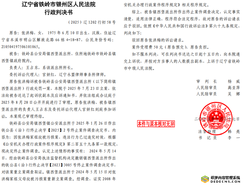 面对这一明显违背生效判决的行政行为,张洪梅一家再次提起诉讼,然而此次的司法结论却来了个180度大转弯。铁岭市银州区法院杨威法官审理后,居然做出(2025)辽1202行初58号民事判决书,判定派出所第二次作出的终止调查决定合法有效,派出所胜诉。