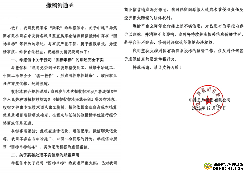 本站讯 2025年12月3日,一份措辞严厉的实名举报信打破了招投标市场的平静。举报人梁毅以承担全部法律责任的郑重态度,分别致信中国储备粮管理集团有限公司邓亦武董事长及山东省纪委李伟书记,直指10月28日开标、事关国家粮食安全的中央储备粮日照直属库仓储项目招投标过程中,多家企业存在恶意违法违规操作,将本应严谨公正的"民生工程"异化为围标串标的"利益场"。举报信引发公众广泛关注之际,涉事核心企业中国建筑第三工程局总承包公司山东分公司(下称"中建三局山东分公司")的系列操作更添疑云——不仅多次联系相关平台要求删帖,声称举报内容与事实严重不符,其总公司也始终保持沉默,未采取实质性调查动作,让这场招投标风波的真相愈发扑朔迷离。