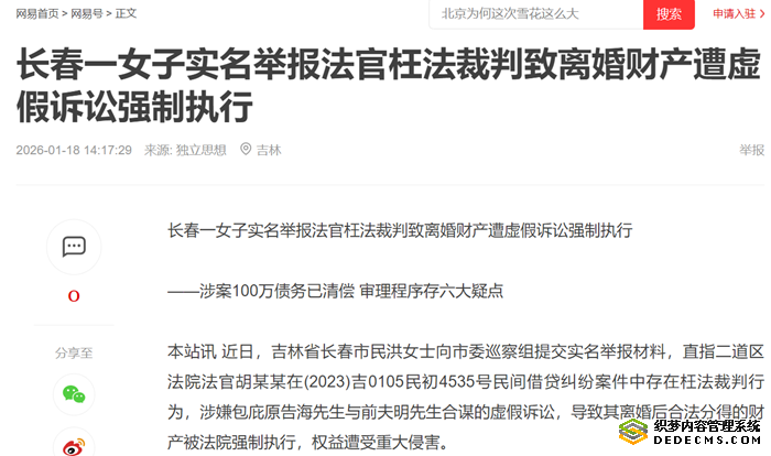 举报材料显示,洪女士与明先生原系夫妻关系,因明先生出轨案外人佟女士,双方解除婚姻关系,离婚协议明确房屋等财产归洪女士所有,且已完成分割交割。然而财产分割完毕后,佟女士的妹夫海先生突然以民间借贷纠纷为由将洪女士与明先生诉至二道区法院,要求二人共同偿还所谓“夫妻共同债务”,最终法院判决支持海先生的诉讼请求,并对已归属洪女士的财产采取强制执行措施。
