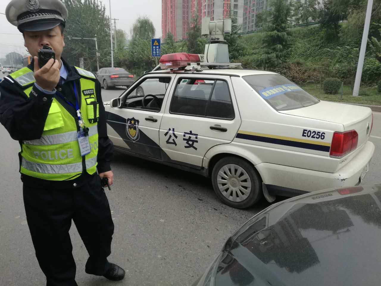 (本网记者 雨田)2016年10月13日上午11时许,记者坐朋友的车在华山大街与杜化路丁字路口西约三四十米处,由西向东行驶,司机感觉车的轮胎压力不够,欲去丁字路口西北角汽车修理厂给轮胎补点气,紧在朋友车前边一辆车号为:“陕E1873警”的警车,突然左打方向,挡住朋友的车,车上下来一高一矮两个交警,高个子交警大声呵斥司机:“你在哪个驾校学的执照,会不会开车?”记者下车欲给交警解释一下,他反而大声质问记者:“你是干什么的?”记者本不想亮明身份,无奈只得实事求是的说:“我是人民法治的记者”。两个警察听到记者说自己是记者,更是恼羞成怒地说:“你是记者还能咋?有证件没有?”矮个子警察把自己的上岗证拿到手里说:“我叫郑辉,你把我记下,你是记者还能把我咋?”高个子警察指头弹着警车的引擎盖说:“我就是这样弄哩,看你能把我咋?”