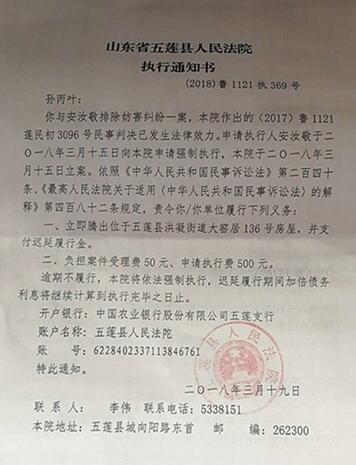 同样的问题,记者采访洪凝法庭时吃了闭门羹。孙丙叶的反映材料转送五莲法院后,截止发稿前,记者没有接到该法院的回复。但孙丙叶却接到了五莲法院执行该院(2017)鲁1121民初3096号民事判决的通知书。