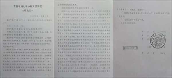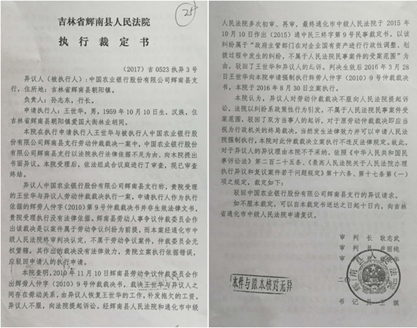 辉南农行对此裁定不服,于2017年6月向通化中院申请复议。当年12月,通化中院以该案不属于劳动争议案件等为由,终审裁定撤销辉南法院(2017)吉0523执异3号执行裁定,驳回王世华的执行申请((2017)吉05执复69号)。