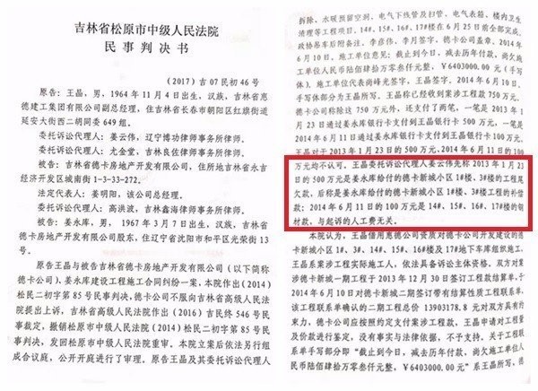 松原市中级法院开庭审理后,于2016年6月5日做出一审判决(【2017】吉07民初46号)。该判决书记载:在法庭上,王晶的委托代理人姜云伟先称2013年1月23日的500万元是姜先生给付的德卡新城小区1#楼、3#楼的工程尾欠款,后又称是姜先生给付的德卡新城小区1#楼、3#楼的工程补偿款。该判决书还写到:“本院认为,关于工程联系单手写部分,即‘截至到今日,减去历年付款,尚欠施工单位人民币:陆佰肆拾万零叁仟元整,¥6403000.00元,’系王晶所写,德卡公司不予认可,且提供双方代表签字确认联系单时的照片,确实未见手写部分内容,故对手写部分不予确认。”