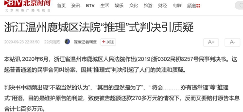 本站讯 2020年6月,浙江省温州市鹿城区人民法院作出(2019)浙0302民初8257号民事判决书。这起普普通通的民事合同纠纷案,因其“推理式”判决引起了人们的关注和质疑。