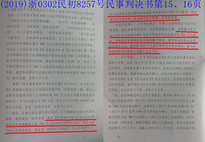 法院认为,涉案的《补充协议书》及《会议纪要》均约定附条件的免除董学和800万元债务,董学和对所附的具体条件均未达成,故免除800万元债务的约定不发生效力。