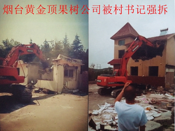 2019年末至2020年初,姜善路以拆违的名义,在烟台黄金顶果树研发公司不知情的情况下,与开发商勾结动用钩机等大型机械,将这里拆毁、毁坏、连根拔除,造成损失达数千万元。