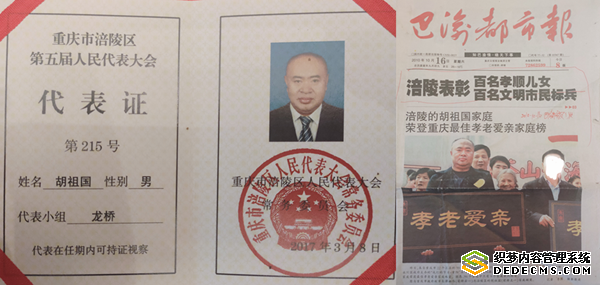 胡祖囯,男,现年51岁,中共党员,曾任社区党委书记,涪陵区两届人大代表,重庆市人民检察院人民监督员,重庆市最佳孝老爱亲家庭获得者,重庆市两新组织优秀共产党员,涪陵区优秀共产党员,涪陵区关工委先进个人,重庆市司法局优秀人民监督员,涪陵区十佳返乡创业明星,涪陵区创业明星,涪陵龙桥街道优秀党务工作者,助力脱贫功坚荣誉称号,涪陵区政府十星级农户标兵。