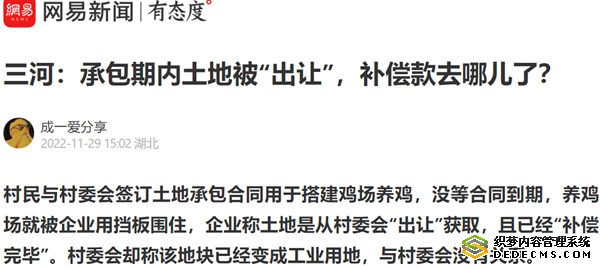 据村民刘艳称:2003年,她与泃阳镇北陈庄村村委会签订养鸡场承包协议书,承包了北陈庄西坑上坡白地三亩地,合同载明用于养鸡,每年承包费860元,承包期限30年2003年至2033年到期。现在合同没有到期就被企业圈占了,怎么会“合理合法”?