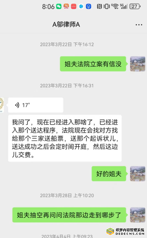 3月22日,邬春旭律师通过微信告知孙荣增,三起案件不但已经立案,且已经进入送达程序。