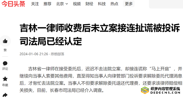 吉林省一律师在接受委托后,迟迟不去法院立案,却接连谎称“马上开庭”,并继续向当事人索要其他费用,直至得知当事人向律管部门投诉要求解除委托代理消息后,才匆忙去法院立案。当事人不但要求解除委托退还代理费,还要求该律师赔偿相关损失,目前,长春市司法局已经介入调查。