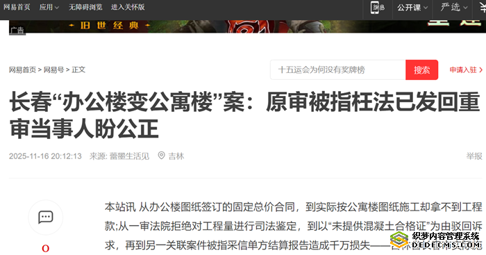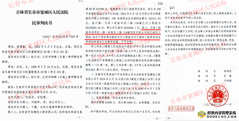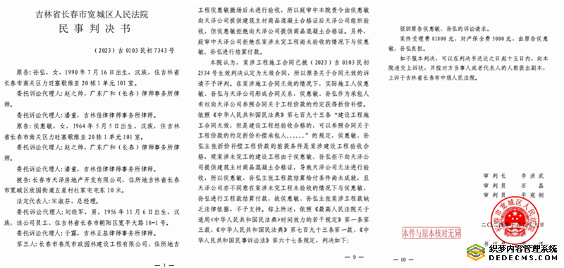 本站讯 从办公楼图纸签订的固定总价合同,到实际按公寓楼图纸施工却拿不到工程款;从一审法院拒绝对工程量进行司法鉴定,到以“未提供混凝土合格证”为由驳回诉求,再到另一关联案件被指采信单方结算报告造成千万损失——吉林省长春市实际施工人侯惠敏与长春市天泽房地产开发公司(下称“天泽公司”)的工程款纠纷,历经一审程序后陷入“维权困境”。如今,多家媒体曝光后,随着长春市中级法院以“事实不清”为由将其中一案(7343号)发回重审,侯惠敏终于看到了维权的曙光,她感谢法官的公正履职与检察机关的监督支持,期待重审能还自己一个公道。