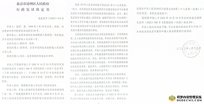 -——2023年6月,镇政府新作出的限期拆除回填决定书及强制拆除决定书,再次被通州区政府确认违法;