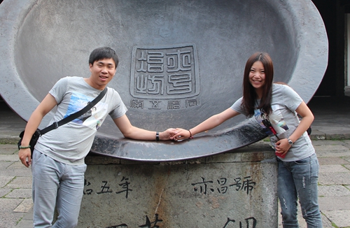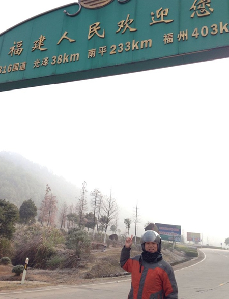 图5为李恒带着李玉从太原骑着摩托车到达福建,李恒在福建届门前留影。