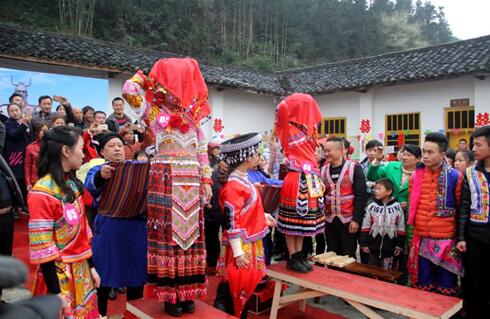 中国视点网3月5日讯(申勇 记者高学兵)“寻根究底,寻得今年是个好年辰,爹妈今天有个吉祥日,妈妈起来煮饭,爹爹起来杀鸡,要把女儿嫁出去……”3月5日,在苗族女歌手高亢的《嫁女歌》中,一场原汁原味的苗族集体婚礼在兴文县麒麟苗族乡德应村举行。